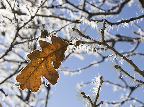 I liked this image, but what drew me into the image were the sharply defined ice crystals on the branch leading up to the leaf. The out-of-focus branches on the left side of the image were a bit distracting, and I thought the image could have been stronger with a crop like this: