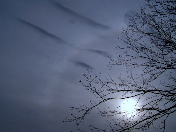 Since the "halo" was a central element in the image, I emphasized the halo a bit more in the version of the image below. I added a second layer in Photoshop, used the "shadows and highlights" adjustment to bump up midtone contrast, added a layer mask set to "hide all" and then erased through the portions of the mask covering the halo, and then used the "opacity" slider on the layers palette to tone down the adjustment on the top (contrasty) layer. The change is subtle; however, I felt it enhanced the halo without degrading other aspects of the image.