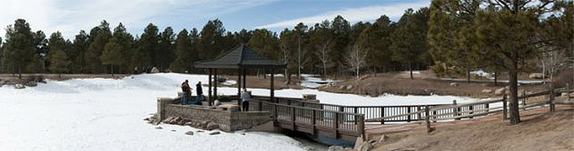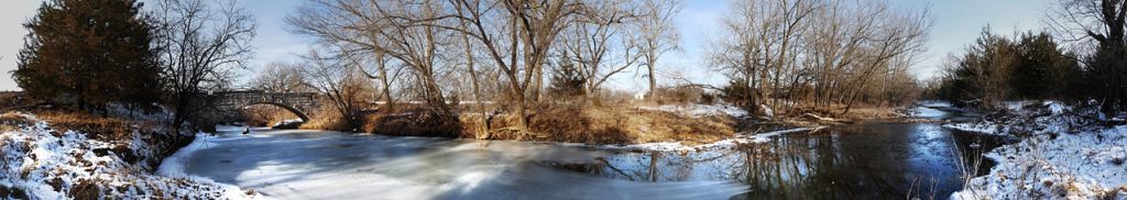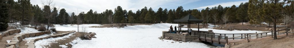 Sue did a very nice job stitching her Fox Run Park image.  Although it was a nice stitch, the image almost looked like two different scenes, one on the right, and one on the left.  I thought the scene on the right was a beautiful scene that lent itself well to a panoramic image, and that the scene on the left was a distraction.  I tried an alternate crop that I thought highlighted the wonderful scene on the right.  The crop is posted just below the original.