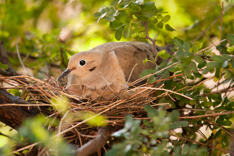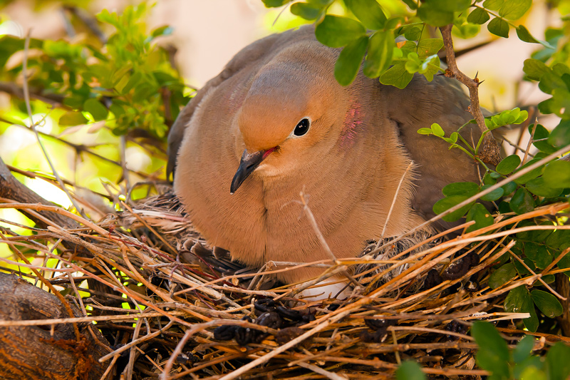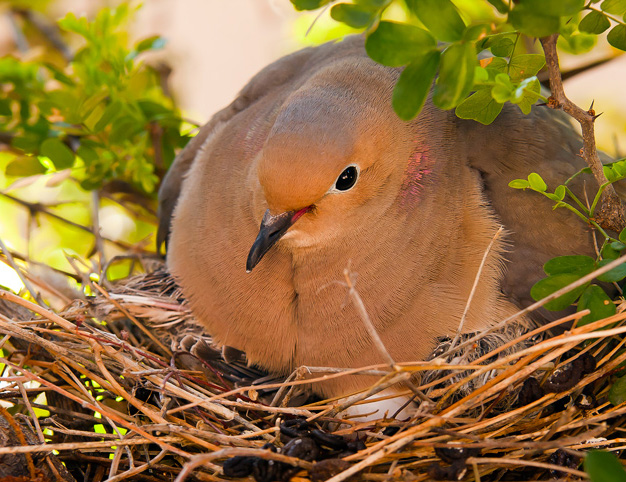 When I looked at Lorin's image, there were several areas that I felt contributed to "context" and several others that contributed to the overall design and aesthetic beauty of the image. The nest of course, was critical to effectively telling the story. The small branch just above and to the right of the dove (from the viewer's perspective) was aesthetically appealing, as were the leaves in the background to the left of the dove. I felt that many of the other leaves and branches included in the composition either didn't contribute to the aesthetic appeal, or were distracting. With that in mind, I propose the crop below, with the goal of including only those elements that are important to telling the story, or adding to the aesthetic appeal of the image.